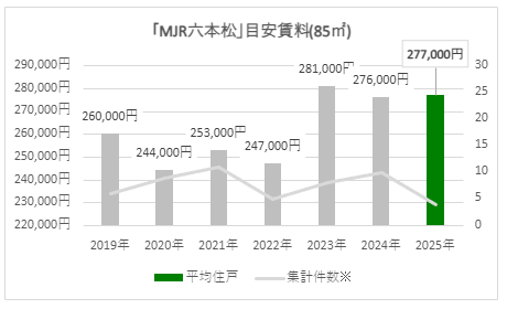 このデータから、MJR六本松の85㎡クラスの平均住戸目安賃料は、直近3年間(2023年〜2025年)で277,000円〜281,000円程度が周辺相場の適正水準となっていることがわかります。