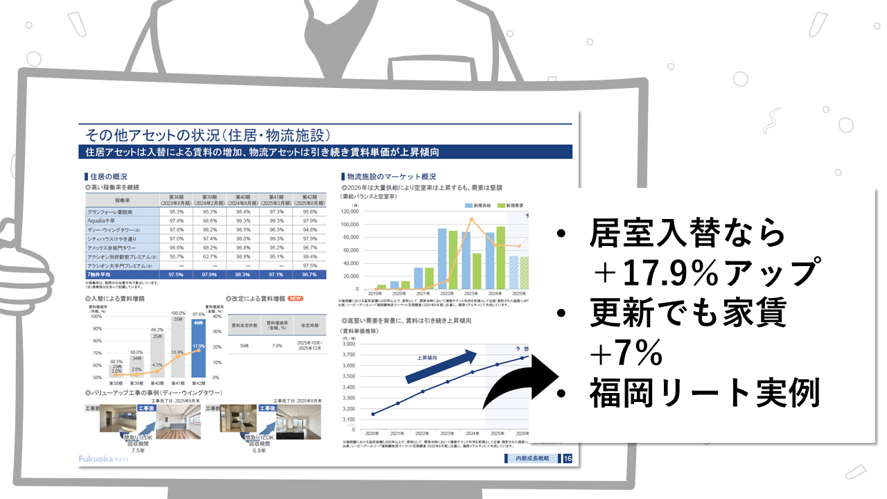福岡リートが「+7.0%」の更新値上げを成功させていること自体、プロとして凄まじい交渉力ですが、それでもマーケットの急騰スピードには追いついていないんです。